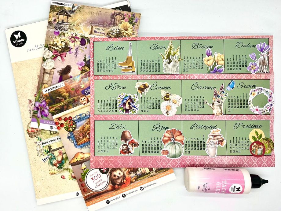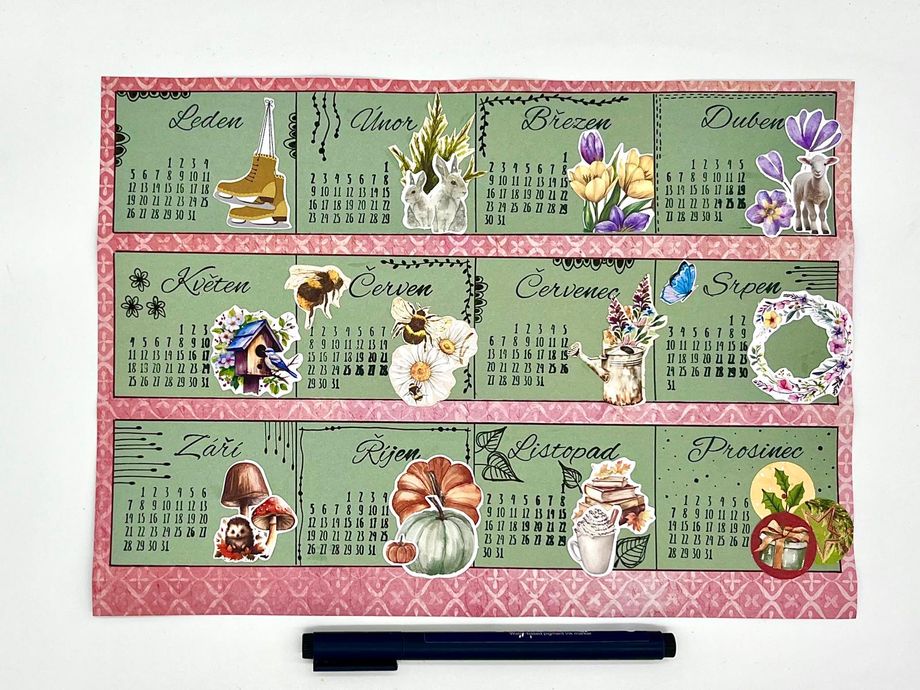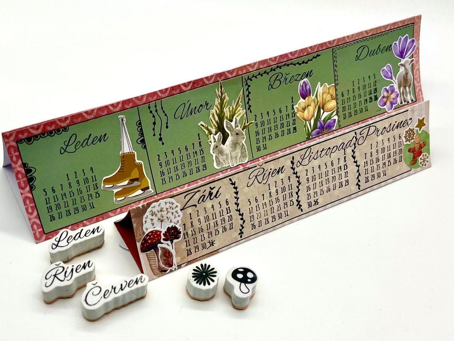 Jednoduchý kalendář Návody 20. 1. 2026 Hledáte jednoduché tvoření, které je zároveň praktické? V tomto návodu vám ukážeme, jak vyrobit malý stolní kalendář, který se vejde na pracovní stůl i poličku. Zvládnou ho dospělí i děti a výsledek vám bude dělat radost po celý rok. Aktuality Bullet Journal Tvoření z papíru Potřebný materiál a pomůcky: Barevný nebo vzorovaný papír Jednobarevný papír Pravítko Obyčejná tužka Tekuté lepidlo Nůžky Knihařská kost na rýhování Černý liner Sada razítek „Kalendárium“ Sada razítek „Roční období“ Černý razítkovací polštářek Vylupovací obrázky Postup: 1. Nachystáme si barevný nebo vzorovaný papír o velikosti A4 a narýhujeme ho dle nákresu a jednotlivá políčka naohýbáme. 2. Z jiného, tentokrát jednobarevného papíru (doporučujeme světlejší odstín), si nachystáme 3 proužky o velikosti 28 x 5,5 cm a nalepíme je doprostřed jednotlivých políček. 3. Každý pásek rozdělíme na čtyři stejná políčka, rýsujeme černým tenkým fixem. Vznikne nám tak 12 obdélníčků – na každý měsíc v roce jeden. 4. Do každého políčka narazítkujeme černým razítkovacím polštářkem příslušné kalendárium a také název měsíce. 5. Dozdobíme vylupovacími obrázky. 6. Černým linerem ještě můžeme dokreslit drobnosti – ozdobné rámečky, kytičky, lístky apod. 7. Poslední úzké políčko kalendáře potřeme lepidlem a slepíme celý kalendář v trojúhelníkový stojánek. Máme hotovo. Další tipy pro vás: Políčka můžeme také nazdobit některými z široké nabídky razítek. Také samolepky budou k dozdobení kalendáře perfektní. Zpět do kategorie Další podobné články Návody Jak vyrobit vlastní washi pásku 31. 12. 2025 Washi pásky jsou důležitou dekorativní součástí každého diáře. Není potřeba kupovat pořád další, ukážeme vám, jak lze pomocí razítek snadno vyrobit vlastní. Návody Vylaďte si kreativní diář dle svých představ 31. 12. 2025 Váš bullet journal nemusí být jen praktický, ale i krásný. Jak nazdobit jeho obal, který je nejen funkční, ale i estetický? Nechte se inspirovat v článku, kde najdete přehledné tipy a postupy, jak ho vkusně ozdobit, aby vás bavilo brát ho do ruky každý den. Návody Krabička z papíru na "neforemné" dárky 21. 12. 2025 Zabalit neforemný dárek bývá malá noční můra – papír se trhá, rohy odstávají a výsledek nikdy nevypadá tak, jak bychom si přáli. S jednoduchou papírovou krabičkou si ale poradíte i s těmi nejproblematičtějšími tvary. V tomto návodu vám krok za krokem ukážeme, jak si krabičku snadno vyrobit doma, rychle a bez…