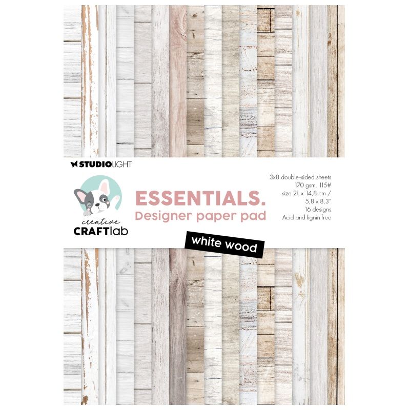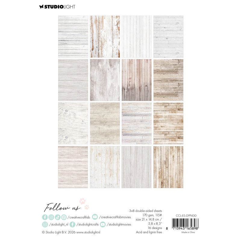 Kreativní sada papírů v bloku s motivy dřevěných planěk a masivního dřeva ve světlounkých barvách z dílny nizozemské značky Studio Light se hodí na scrapbooking, cardmaking a další vyrábění. Podkladový kreativní papír skvěle poslouží jako základ projektu, na který lze vrstvit další prvky – třeba naše oblíbené papírové výseky.