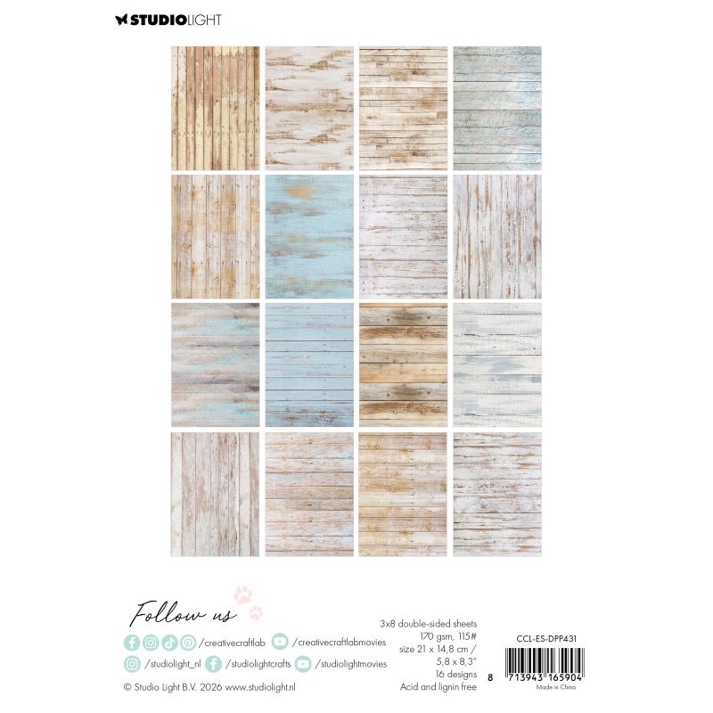Kreativní sada papírů v bloku s motivy jemně oprýskaných dřevěných planěk a masivního dřeva ve světlých barvách z dílny nizozemské značky Studio Light se hodí na scrapbooking, cardmaking a další vyrábění. Podkladový kreativní papír skvěle poslouží jako základ projektu, na který lze vrstvit další prvky – třeba naše oblíbené papírové výseky.