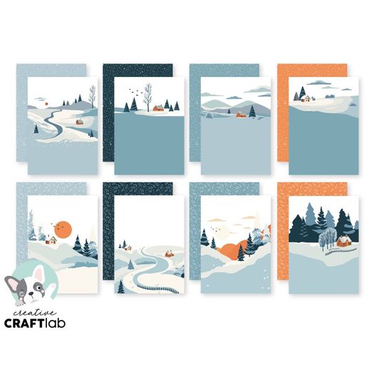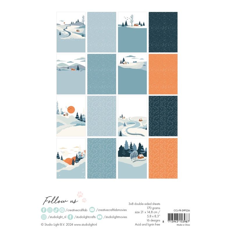Blok scrapbookových papírů se zimními motivy obsahuje 24 listů (8 druhů po 3 ks), včetně papírů s minimalistickými zasněženým krajinkami a papírů s jemnými vzory sněhu a větviček z rubové strany. Využijete je na nejrůznější papírové tvoření, obzvlášť na unikátní vánoční přání a dekorace. Listy formátu A5 mají matný oboustranný potisk. Jsou bez kyseliny a neobsahují lignin, gramáž 170 g/m2.