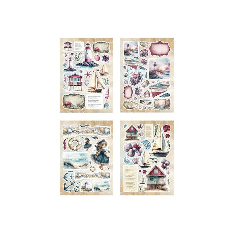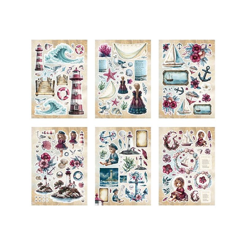 Vylupovací obrázky v bloku s motivy mořského pobřeží z kolekce Tide of Hope („příliv naděje“) se hodí na scrapbooking, cardmaking a další vyrábění. Jednotlivé motivy jsou předvyseknuté, obrázky stačí ze stránky vyloupnout k dalšímu tvoření, nemusí se vystřihovat. Nalepit je na svůj projekt můžete pomocí lepidla , lepicí pásky anebo lepicích 3D polštářků.