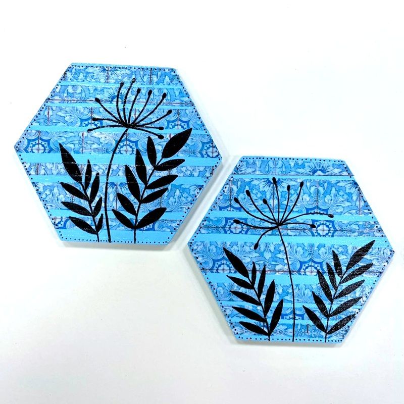 Hexagony poslouží také na výrobu vzorníků, k vyzkoušení různých technik či jako podklad na tečkování mandal nebo na mozaiky. Vystavit jdou ve stojánku pro dřevěné dekorace.