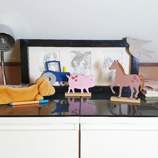 • Kombinování: kombinovat dohromady můžeme nejenom různé techniky, ale i různé výřezy dohromady. Pomocí několika písmen můžeme vytvořit například něčí jméno, které spolu s doprovodným obrázkem na konci či na začátku jména zasadíme do stojánku – to může být zábavná aktivita obzvlášť pro malé umělce, kteří si pak vystaveným dílem můžou třeba „podepsat“ svůj pokojíček.