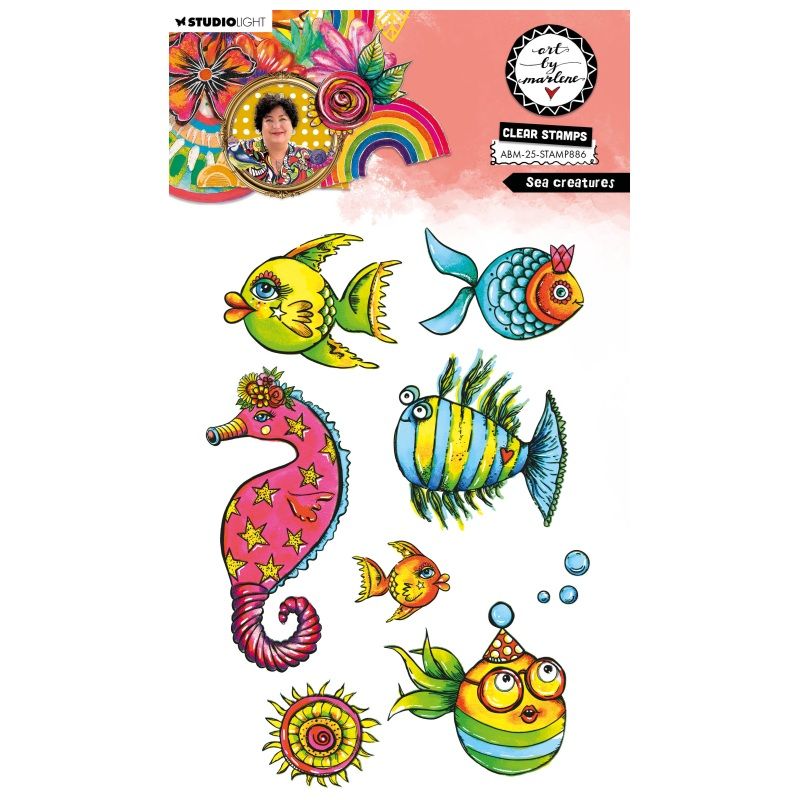 Gelová razítka v sadě s podmořskými motivy, které navrhla umělkyně Art by Marlene , jejíž tvorba je svérázná a vesele barevná. Razítka jsou vyrobená z kvalitního čirého silikonu. Největší výhodou je jejich průhlednost – přesně vidíte, kam tisknete. Používají se s akrylovým blokem .