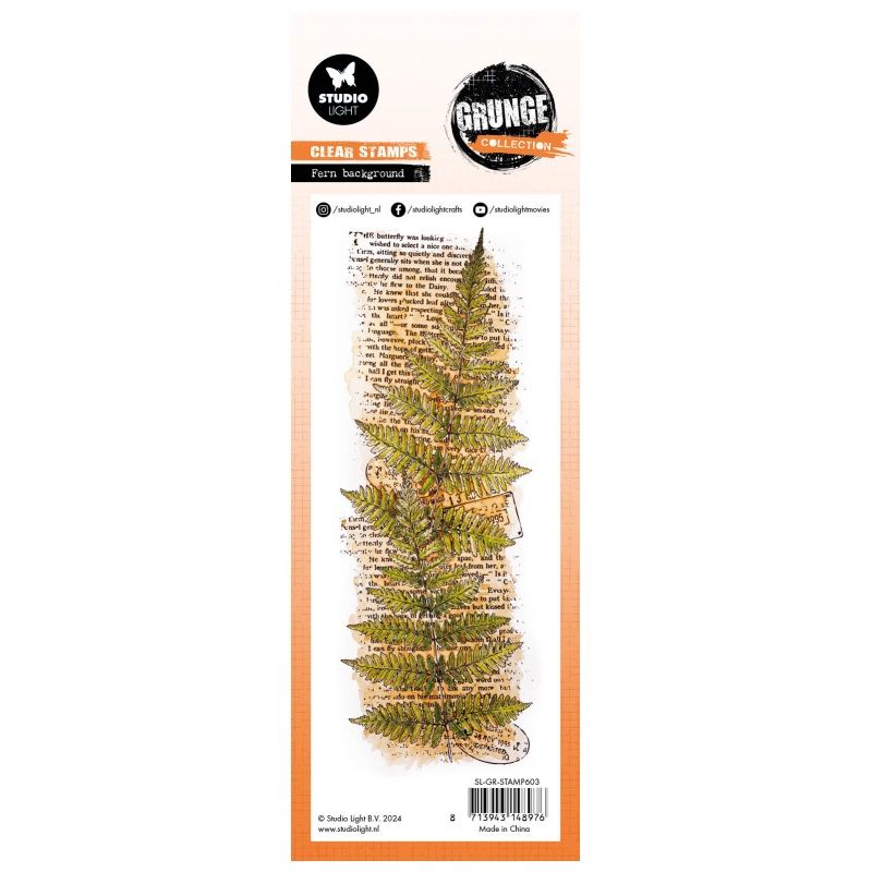 Gelové razítko s motivem kapradin na textovém pozadí z kolekce Grunge. Poslouží skvěle jako velký dominantní motiv přání formátu slimline nebo jiného vertikálně orientovaného díla. Gelová razítka jsou vyrobená z kvalitního čirého silikonu. Jejich největší výhodou je jejich průhlednost, proto se i snadno aplikují, jelikož přesně vidíte, kam tisknete. Používají se s akrylovým blokem.