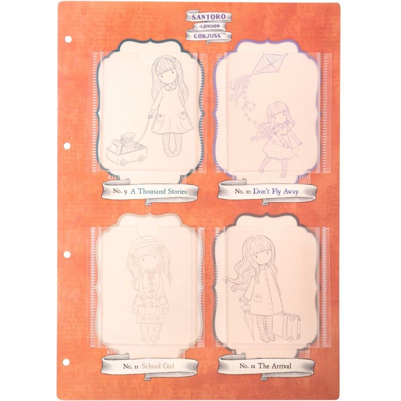 Obsahuje 1 arch, který umožňuje uskladnění 4 mini razítek z podzimní kolekce Gorjuss: Čtenářka , S drakem , Školačka , Na cestách.