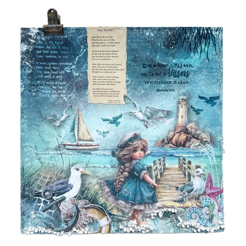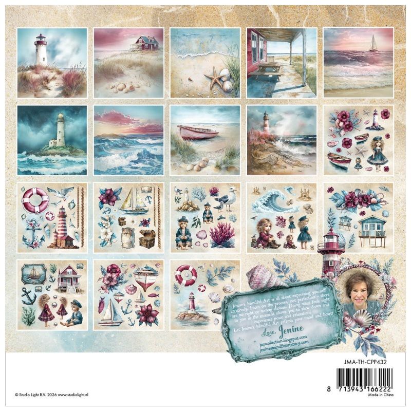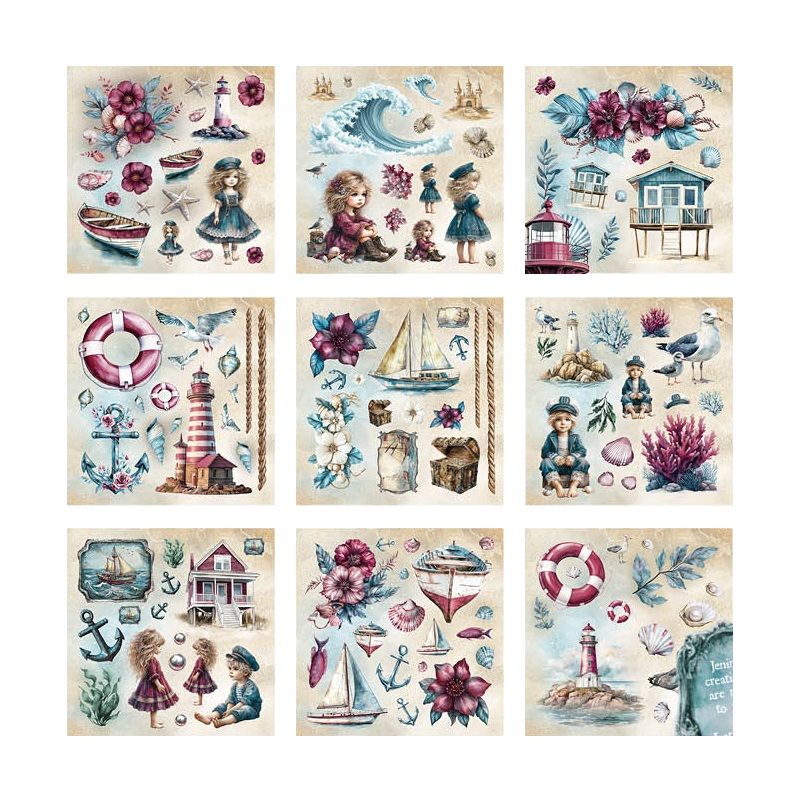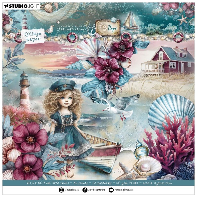 Kreativní sada papírů v bloku s motivy mořského pobřeží z kolekce Tide of Hope („příliv naděje“) se hodí na scrapbooking, cardmaking a další vyrábění. Designový kreativní papír skvěle poslouží jako základ projektu, na který lze vrstvit sladěné obrázky vystřižené z bloku.