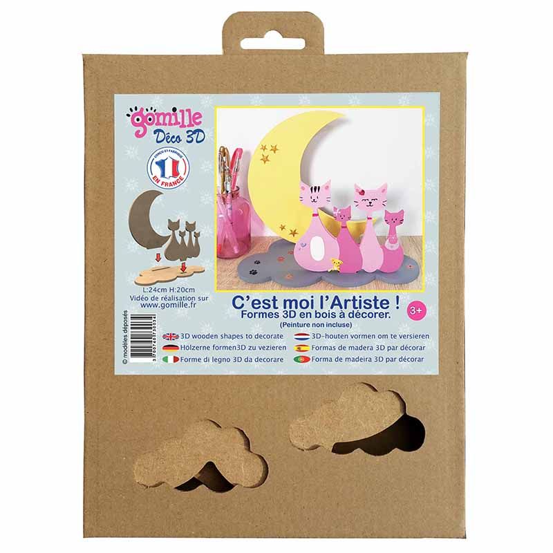 Kreativní sada obsahuje 2 dřevěné výřezy – čtveřici kočiček a srpek měsíce. Ty jde dozdobit, zasadit do přibaleného stojánku a dát na výstavku. Jaké bude mít každá kočička barvy, bude se měsíc usmívat? Je to jen na vás!