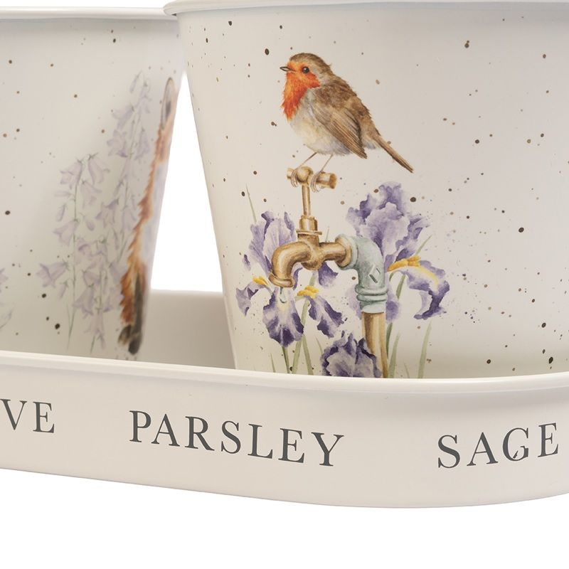 Na prvním květináči vidíme roztomilého králíčka pochutnávajícího si na jeteli. Na druhém je červenka na zahrádce. Třetí květináč zdobí lišče s rozkvetlými zvonky. Spodní miska je kolem dokola dekorovaná jmény bylinek.