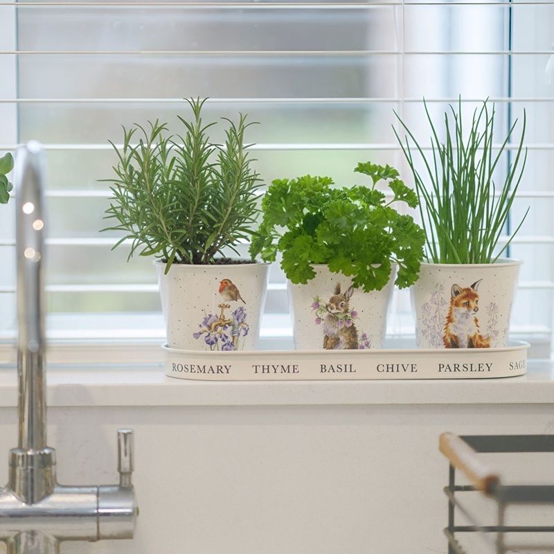 Plechové květináčky ve sladěné dárkové sadě jsou jako dělané k vystavení na parapetu v kuchyni ke kultivaci čerstvých bylinek na vaření. Tři stejně velké květináče kulatého tvaru sedí v ochranné spodní misce, díky níž je lze pohodlně přemisťovat a která zároveň ochrání okenní římsu před vlhkostí a nepořádkem.