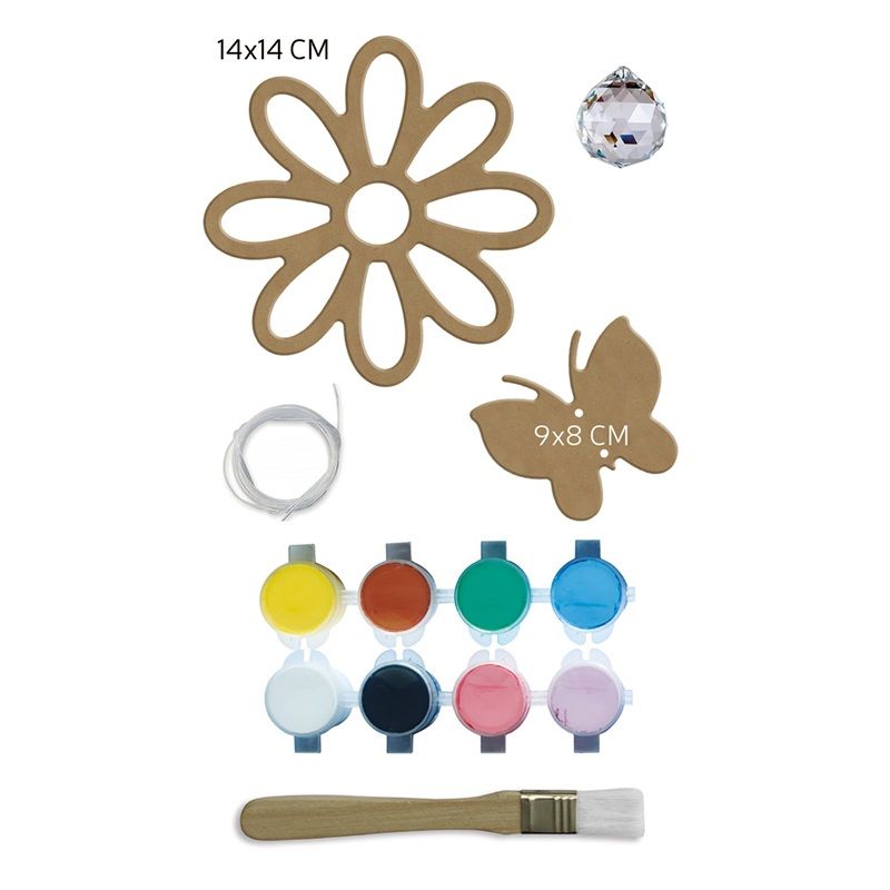 Dětská kreativní sada k výrobě lapače světla s motivem květiny a motýla. Obsahuje 2 dřevěné výřezy, 8 akrylových barev, štětec, lanko a broušenou kouli. Vhodné pro děti od 14 let. Celý popis