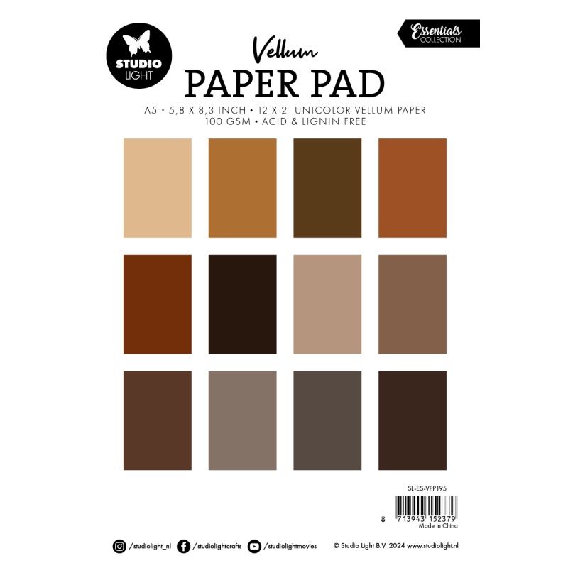 Vellum (neboli pauzovací či pergamenový papír) je neobyčejný dekorační prvek vhodný na jakýkoli papírový projekt, kde chcete vytvořit průsvitnou dekoraci – ideální na průhledy dovnitř přání, dárkových krabiček a scrapbooků či alb, je skvělý na koláže, do art journalu a podobně. V bloku najdete 12 odstínů hnědé po 2 kusech.
