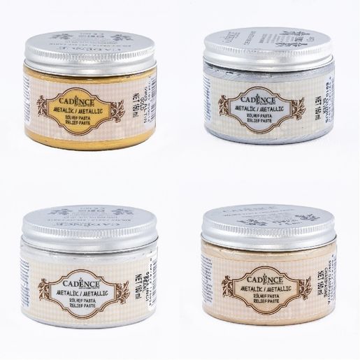 Metalická 3D pasta s jemným kovovým efektem. Na všechny povrchy (kromě textilu), 150 ml. Na vodní bázi. Doba schnutí záleží na nánosu pasty. Doporučujeme pastu nanášet volně špachtlí, štětcem nebo houbičkou. Ideální pro použití pomocí šablon. Chraňte před mrazem. Pomůcky umyjete vodou a mýdlem.