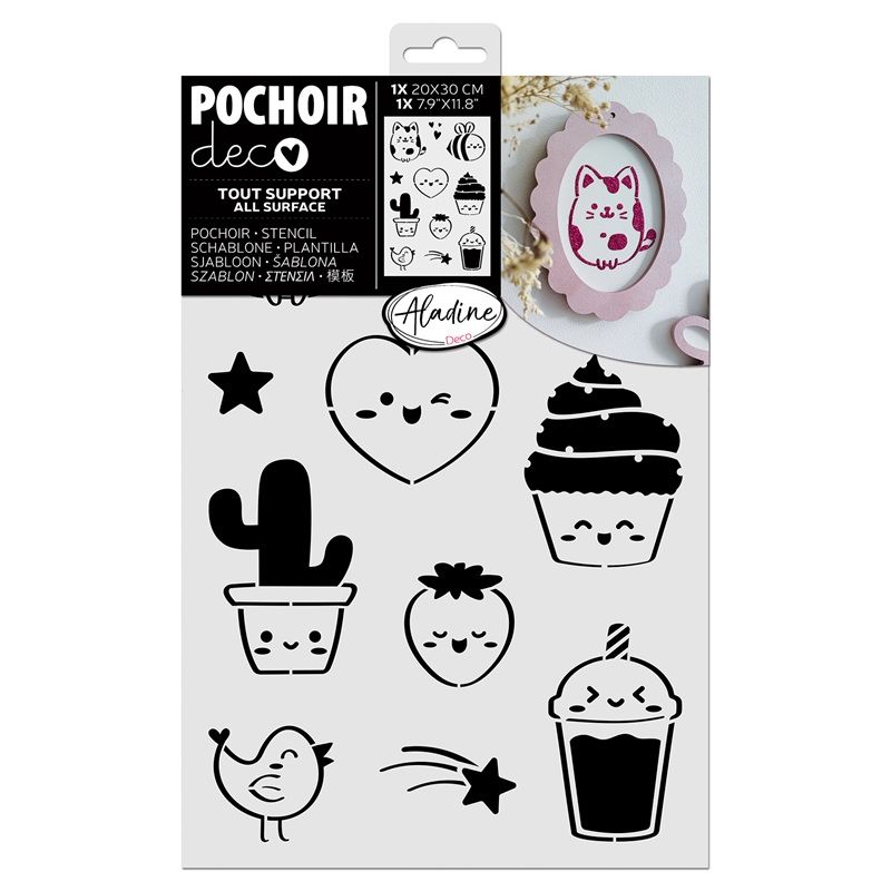 Šablona s motivem dobrot a zvířátek v japonském kawaii stylu je vhodná pro práci s papírem, textilem, dřevem a mnoha dalšími materiály. Rozměr šablonky je 20 x 30 cm, motivy jsou velikostí vhodné na menší projekty, třeba na přední stranu přání.