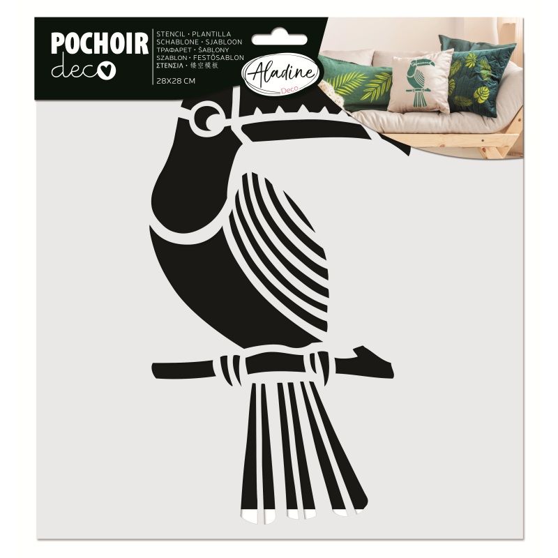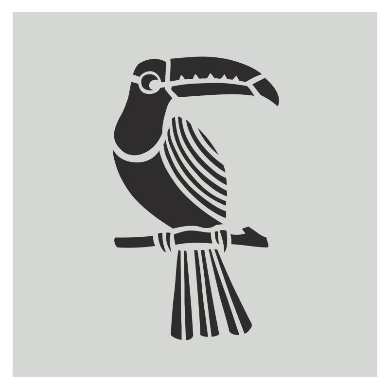 Šablona s motivem ptáčka tukana je vhodná pro práci s papírem, textilem, dřevem a mnoha dalšími materiály. Rozměr šablonky je 28 x 28 cm, takže se obzvlášť hodí na větší projekty – jednoduchá moderní grafika vynikne jako solitér na tričku nebo polštářích.