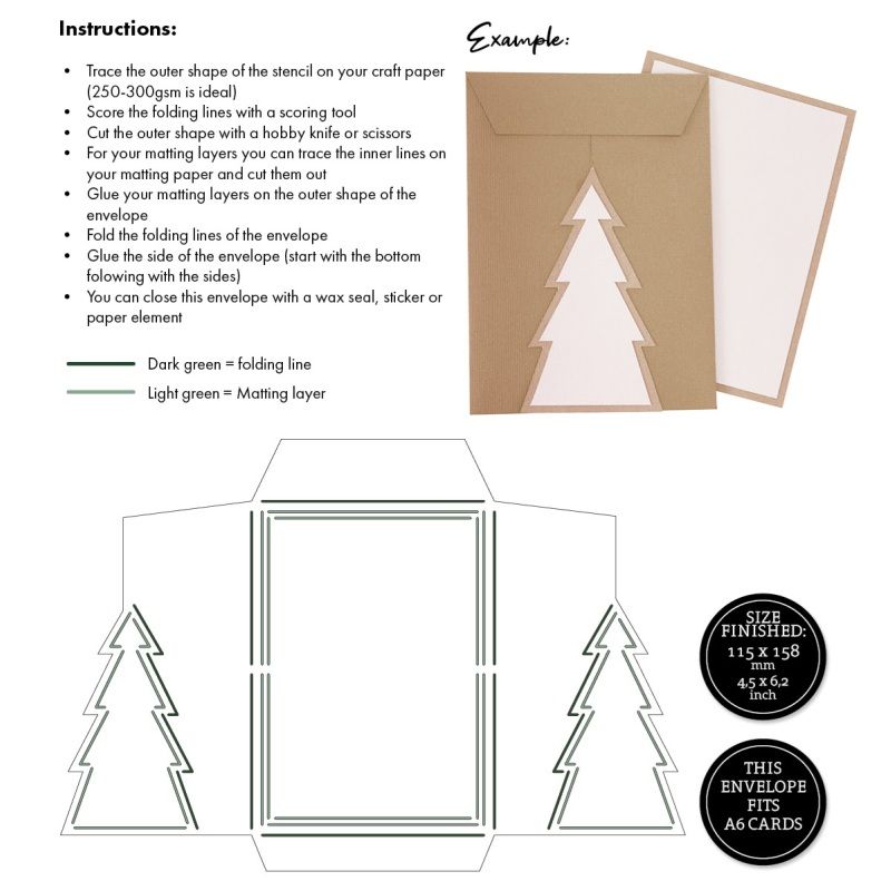 S touto šablonou si jednoduše poskládáte originální obálku s chlopní ve tvaru vánočního stromečku, akorát velkou na přání formátu A6 (10,5 x 14,8 cm). Je vyrobena z plastu a stačí podle ní obkreslit a narýhovat arch papíru, vystřihnout a slepit. Základ obálky lze pak dozdobit podle vlastní chuti. Šablona je pevná a odolná, dá se používat opakovaně, takže můžete obeslat všechny své známé vánočním přáním či PFkem.