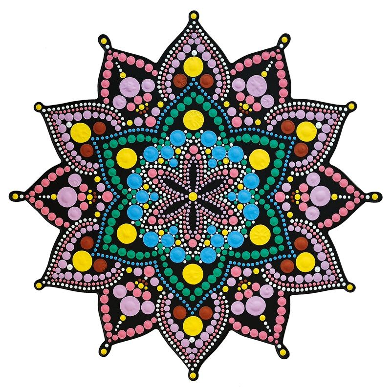 Tečkování rozvíjí kreativitu a soustředění, harmonická symetrie mandaly a jemná ruční práce napomáhá s odreagováním. Šablonu lze používat opakovaně, můžete si dokoupit další Dřevěný výřez, 30 cm - Mandala 2.