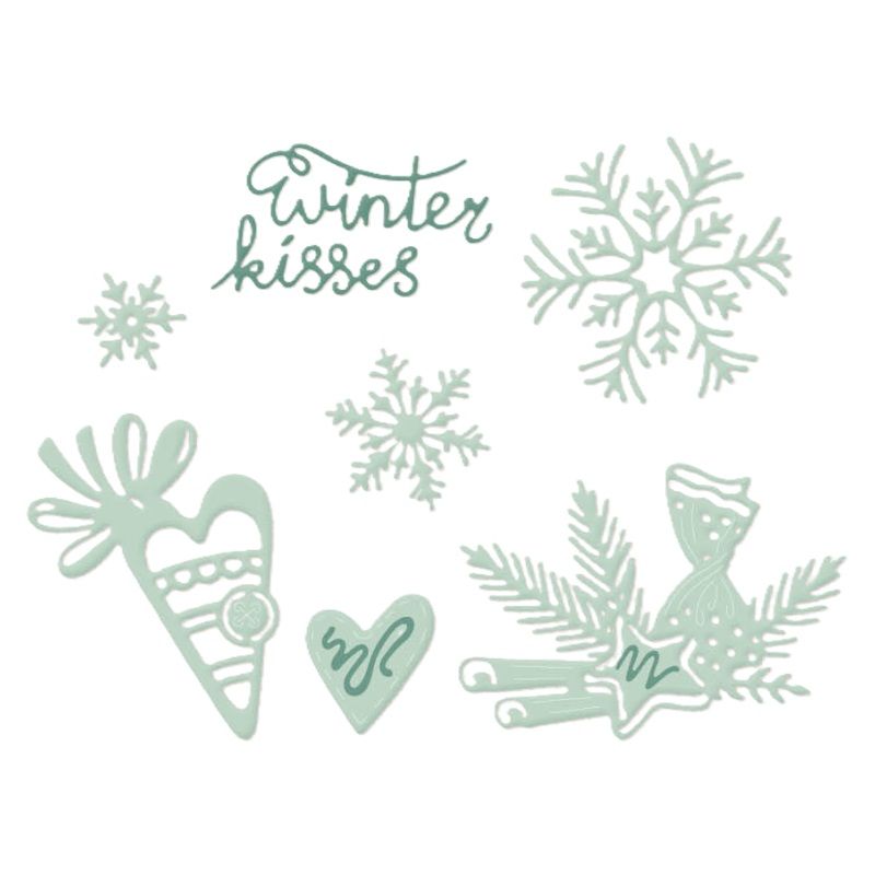 Kovové šablony z kolekce Let is Snow do vyřezávacího strojku typu Big Shot, slouží k vyřezání drobných zimních motivů vloček, srdíček a nápisu "Winter Kisses" (zimní pusinky). Skvěle využijete na výrobu originálního přáníčka, k dozdobení zabaleného dárku, visačky apod. Nápis i vločky obzvlášť vyniknou, když je vyřežete ze třpytivého papíru.